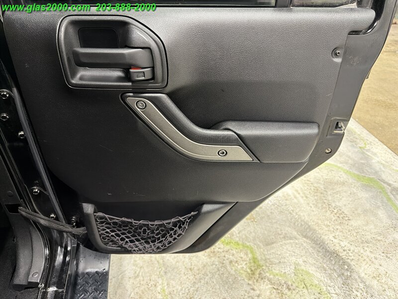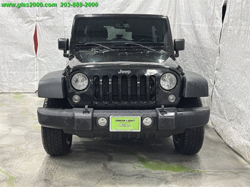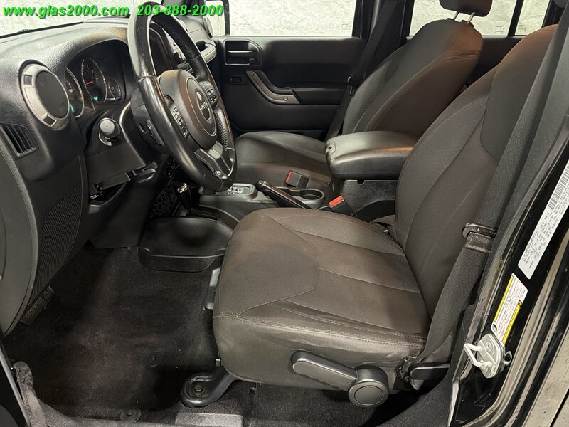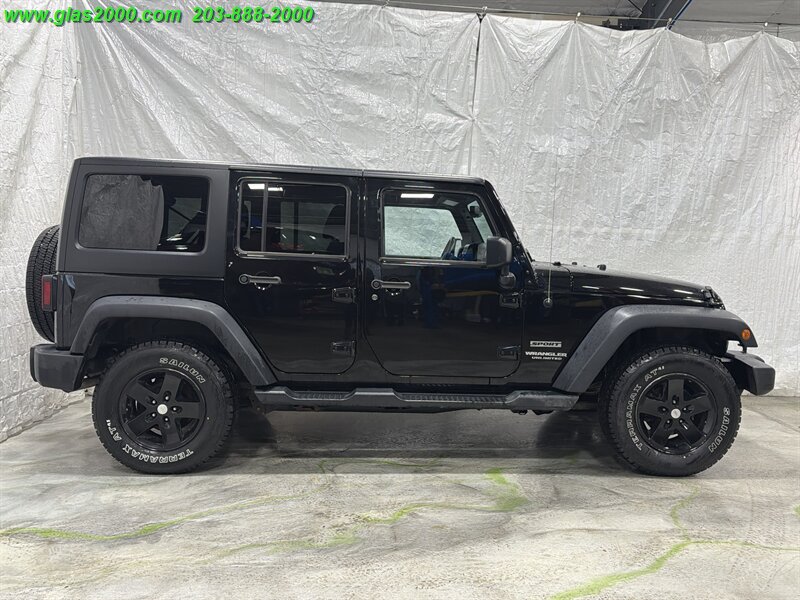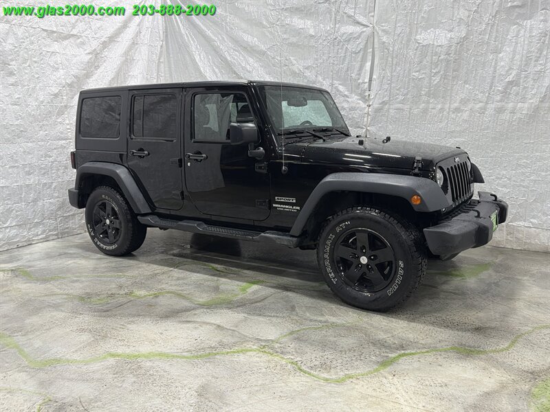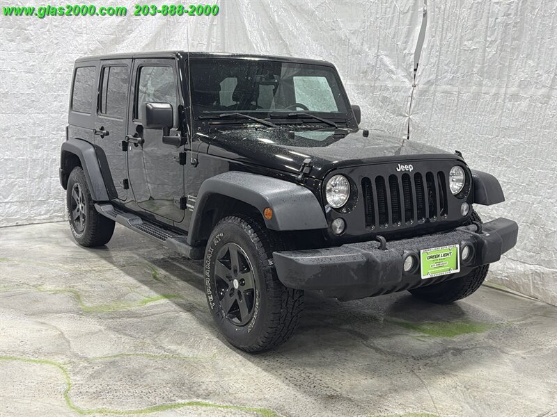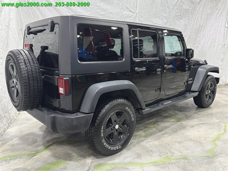 2015 Jeep Wrangler Unlimited Sport in Black Clear Coat with black interior. Powered by the factory 3.6L V6 (285 hp, 260 lb-ft), this four-door Unlimited comes with part-time 4WD and Wrangler’s removable top and doors plus a fold-down windshield. Factory-standard safety and convenience features include anti-lock brakes, electronic stability and traction control, front and side airbags, tire pressure monitoring, air conditioning, cruise control, a basic AM/FM/CD audio system with auxiliary input, 17-inch wheels and a full-size spare, and a folding 60/40 rear seat. This vehicle is in excellent overall condition, has a clean CARFAX, under 104,000 miles (averaging less than 9,000 miles per year), and is rated 16 MPG city / 21 MPG highway.