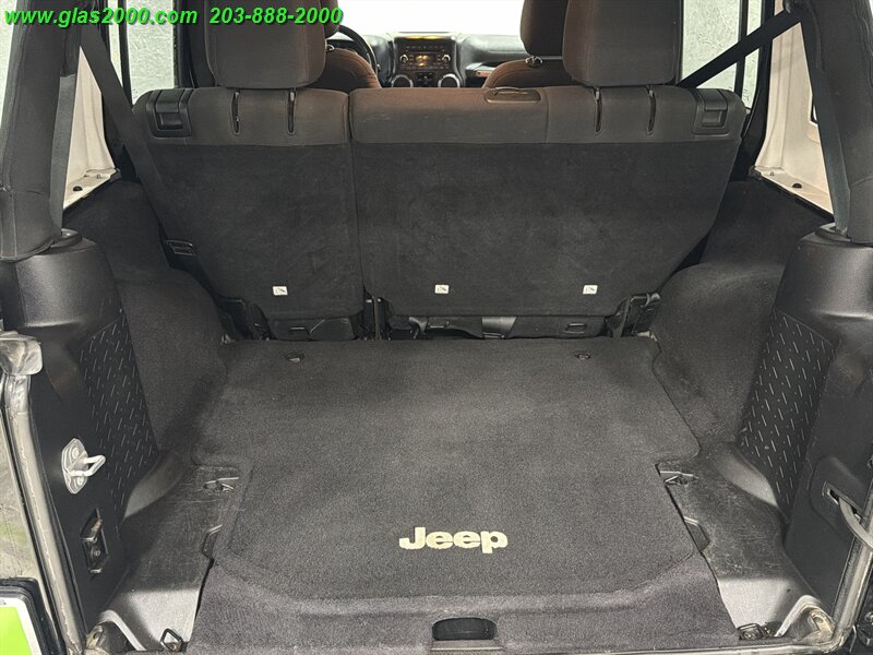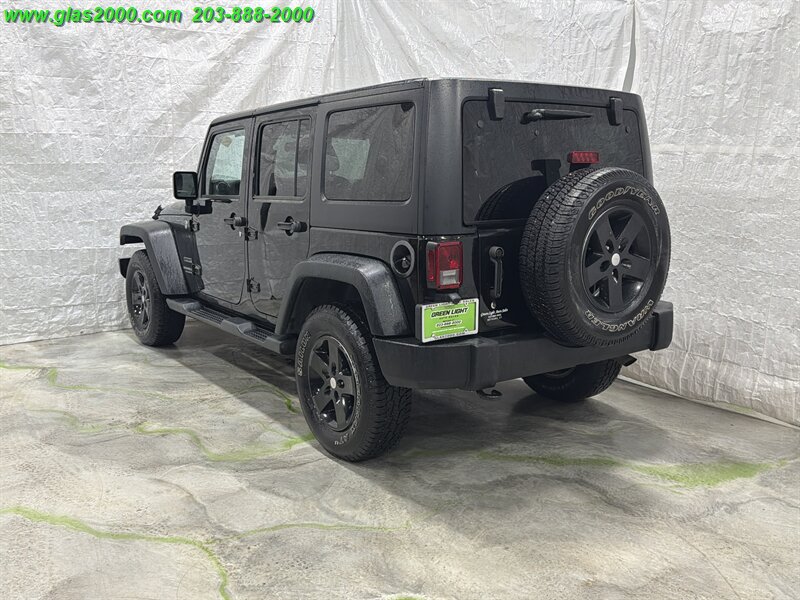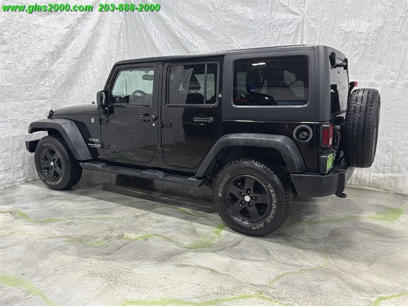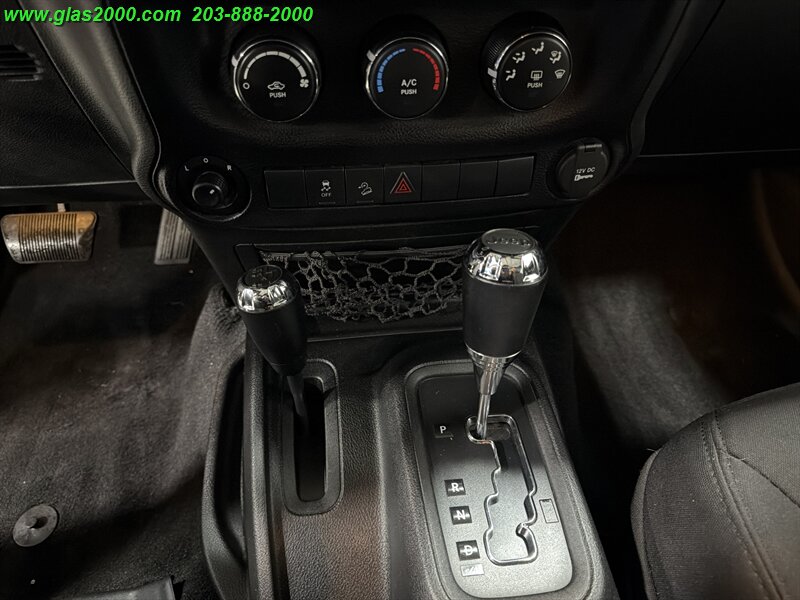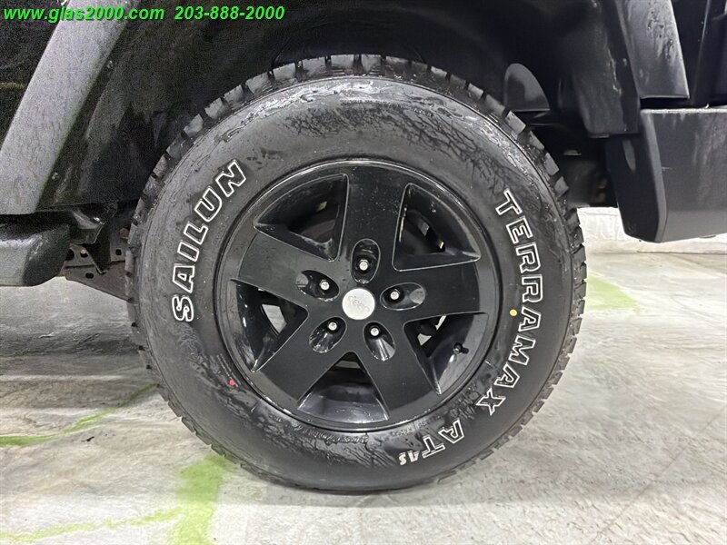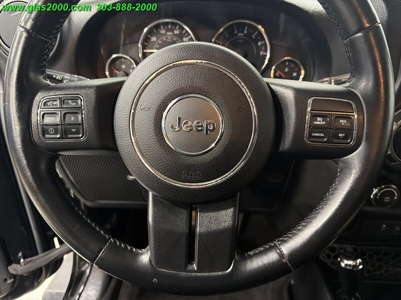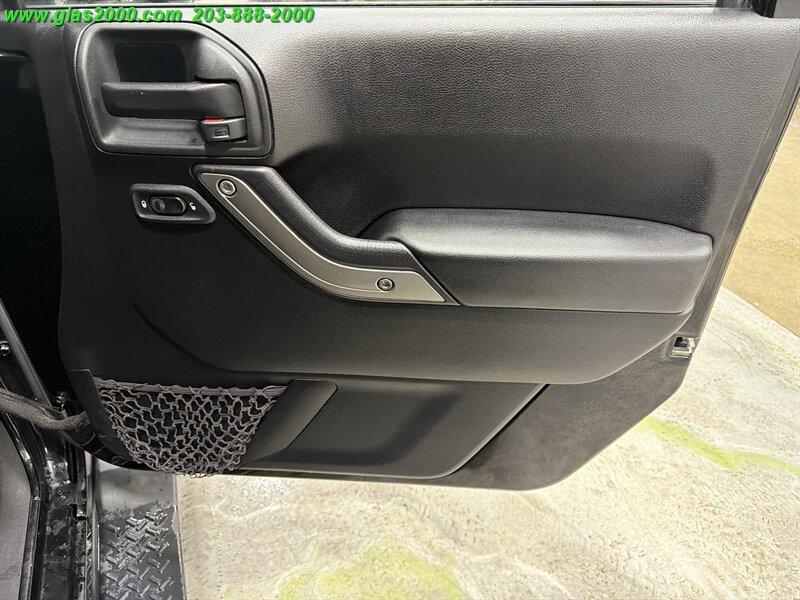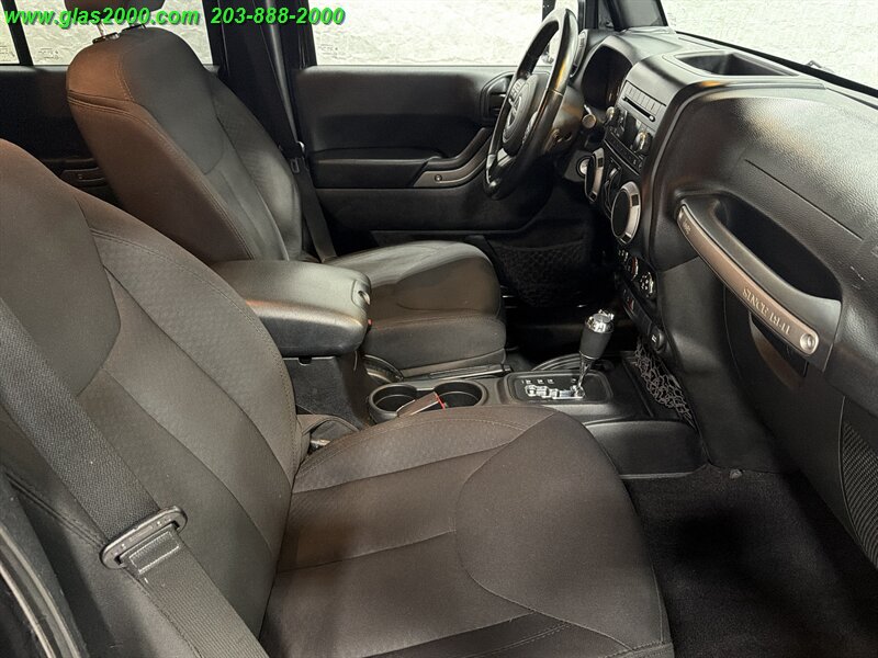 2015 Jeep Wrangler Unlimited Sport in Black Clear Coat with black interior. Powered by the factory 3.6L V6 (285 hp, 260 lb-ft), this four-door Unlimited comes with part-time 4WD and Wrangler’s removable top and doors plus a fold-down windshield. Factory-standard safety and convenience features include anti-lock brakes, electronic stability and traction control, front and side airbags, tire pressure monitoring, air conditioning, cruise control, a basic AM/FM/CD audio system with auxiliary input, 17-inch wheels and a full-size spare, and a folding 60/40 rear seat. This vehicle is in excellent overall condition, has a clean CARFAX, under 104,000 miles (averaging less than 9,000 miles per year), and is rated 16 MPG city / 21 MPG highway.