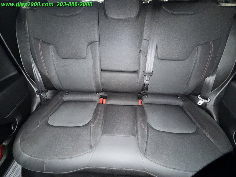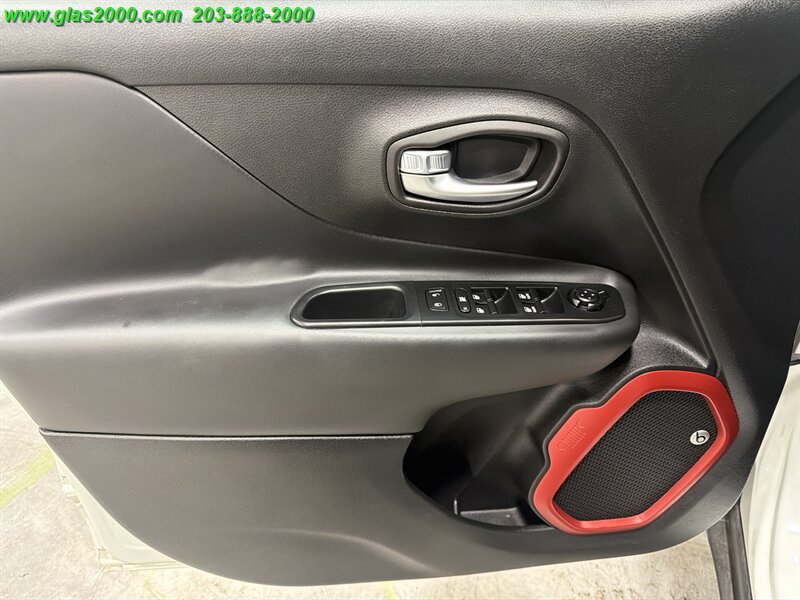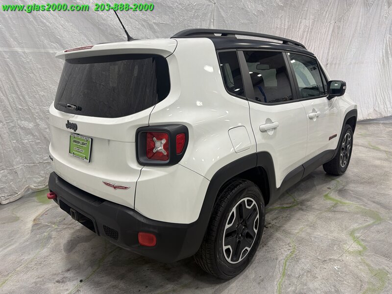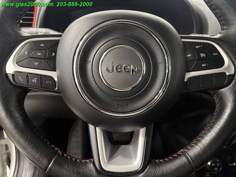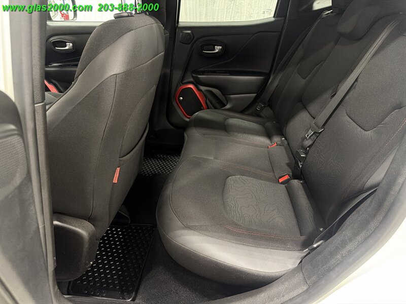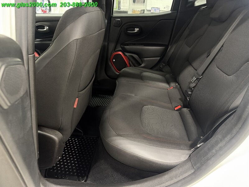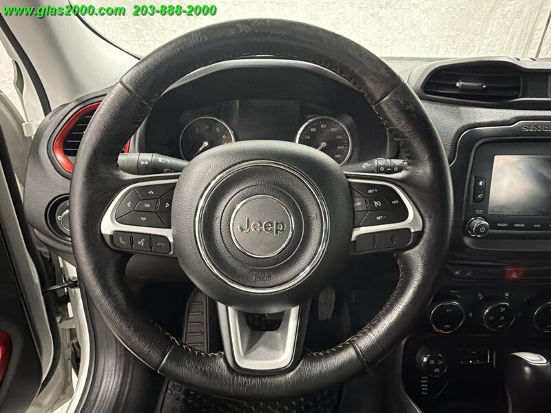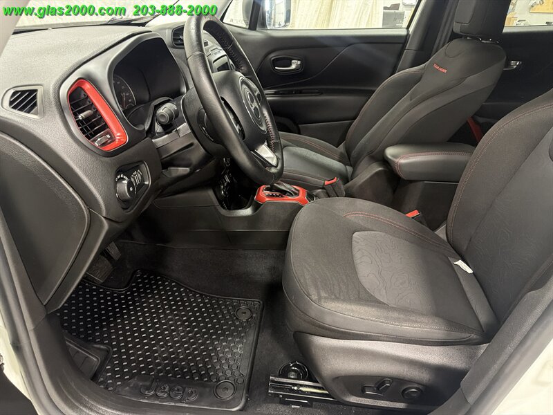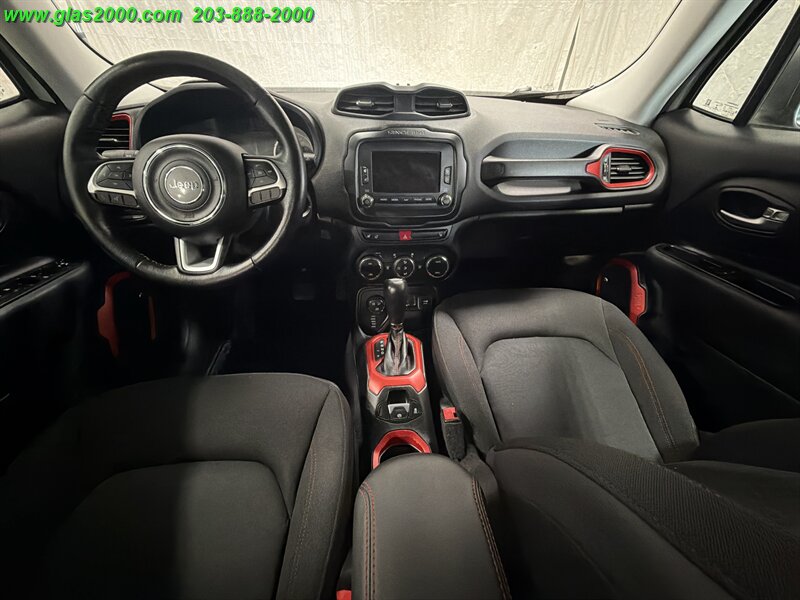 2016 Jeep Renegade Trailhawk in Alpine White with a Black interior, powered by the factory Tigershark 2.4L I4 (180 hp, 175 lb-ft) and the standard 9-speed automatic with Jeep’s Trail Rated 4x4 hardware. Factory-equipped features include the Active Drive 4x4 with Selec-Terrain (Auto/Snow/Sand/Mud/Rock) and low-range capability, Hill Descent Control, skid plates and red tow hooks, raised off-road suspension with all-terrain tires on 17-inch alloy wheels, Uconnect infotainment with touchscreen, Bluetooth hands-free, AM/FM/USB/AUX inputs, power windows and locks, cruise control and steering-wheel audio controls. Safety and convenience gear from the factory includes ABS, electronic stability and traction control, multiple airbags, tire pressure monitoring and a rearview camera. Below 67,000 miles (averaging under 7,000 miles/year), rated at 21 MPG city and 29 MPG highway, and in excellent overall condition.