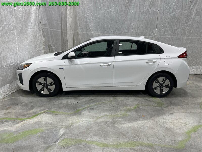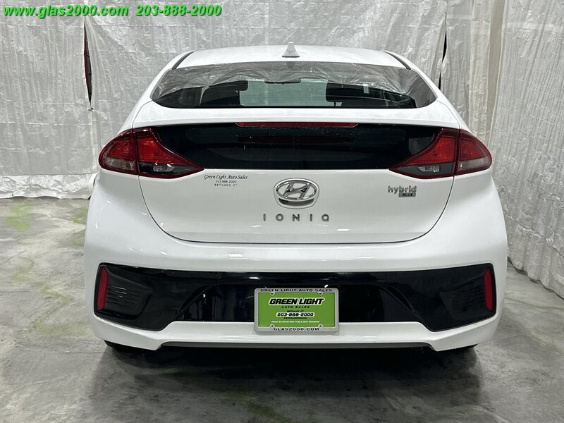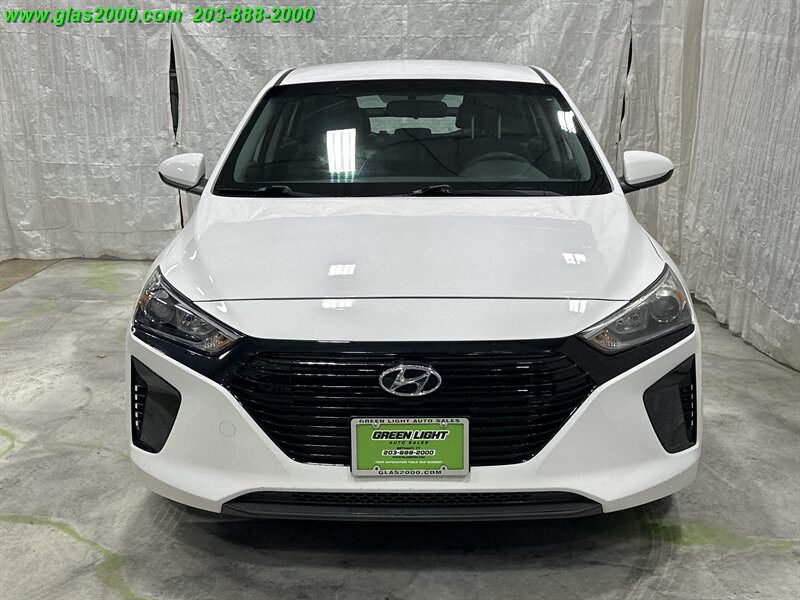 2019 Hyundai IONIQ Hybrid Blue — 1.6L Hybrid I4 (139 hp, 195 ft-lb), exterior White with Black interior. This vehicle is in excellent overall condition, has a clean CARFAX, and is priced below J.D. Power Book value. Factory equipment includes the efficient hybrid powertrain with regenerative braking, advanced hybrid transmission, a standard infotainment display with Bluetooth and smartphone integration, rearview camera, remote keyless entry, power windows and locks, automatic climate control, cruise control and steering-wheel audio controls, cloth seating with split-fold rear seats, and alloy wheels. Standard safety features include ABS, electronic stability and traction control, multiple airbags and tire pressure monitoring. EPA ratings: 57 MPG city / 59 MPG highway.