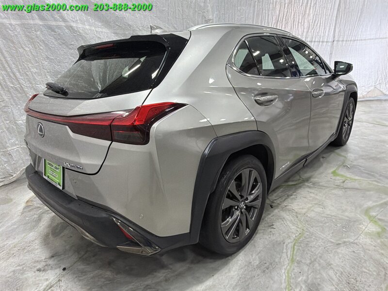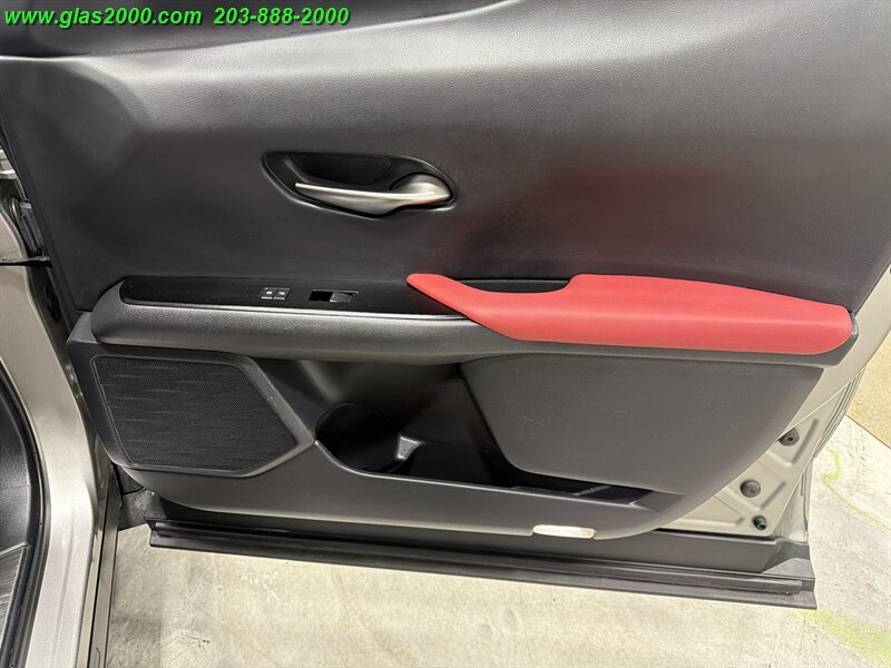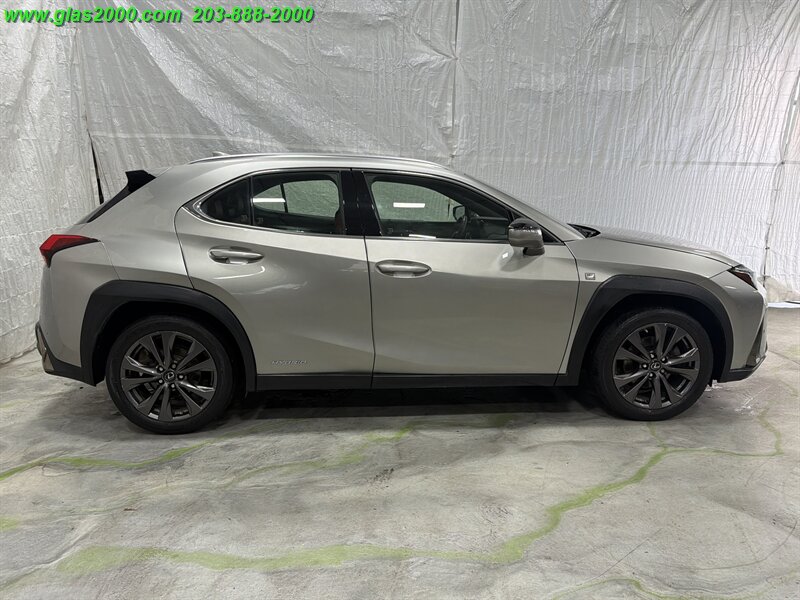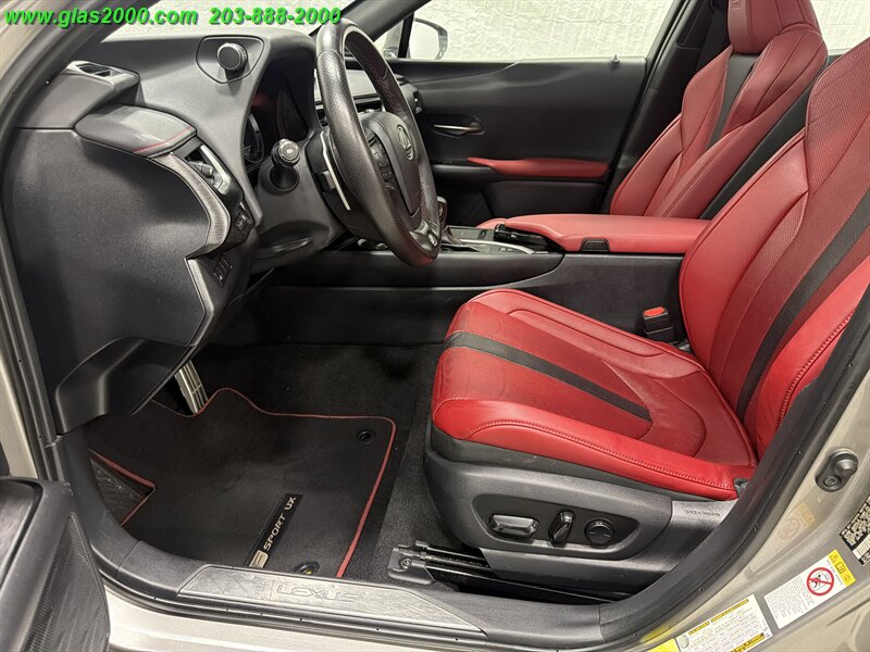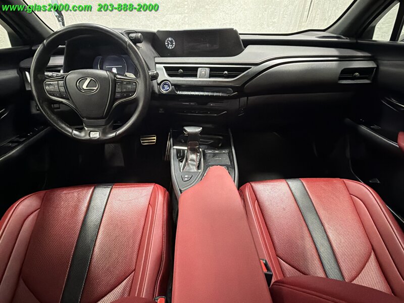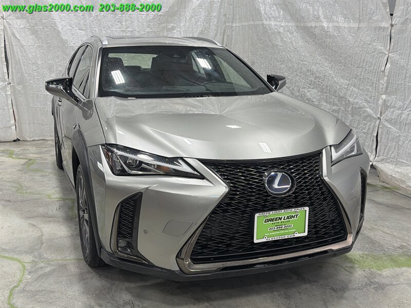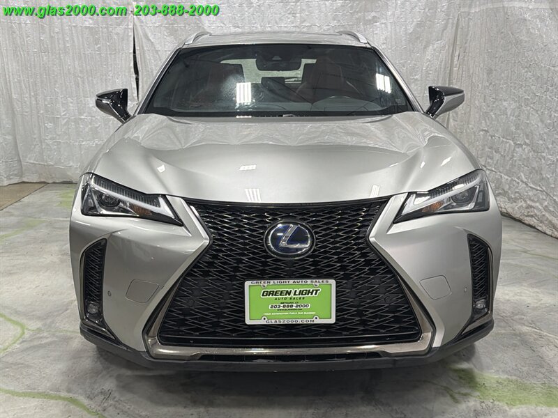 2019 Lexus UX 250h — Silver exterior, Red interior. Factory 2.0L hybrid I4 with a combined 181 hp and continuously variable transmission, EPA-rated 41 MPG city / 38 MPG highway. Factory-standard equipment includes Lexus Safety System+ (adaptive cruise control, pre-collision with pedestrian detection, lane-departure alert with steering assist, automatic high beams), LED headlights and taillights, backup camera, keyless entry with push-button start, automatic climate control, premium synthetic leather seating, power-adjustable driver seat, alloy wheels, Bluetooth connectivity, USB ports and an infotainment display. Priced below J.D. Power Book value, under 58,000 miles (averaging less than 8,000 miles/year) and in excellent overall condition.