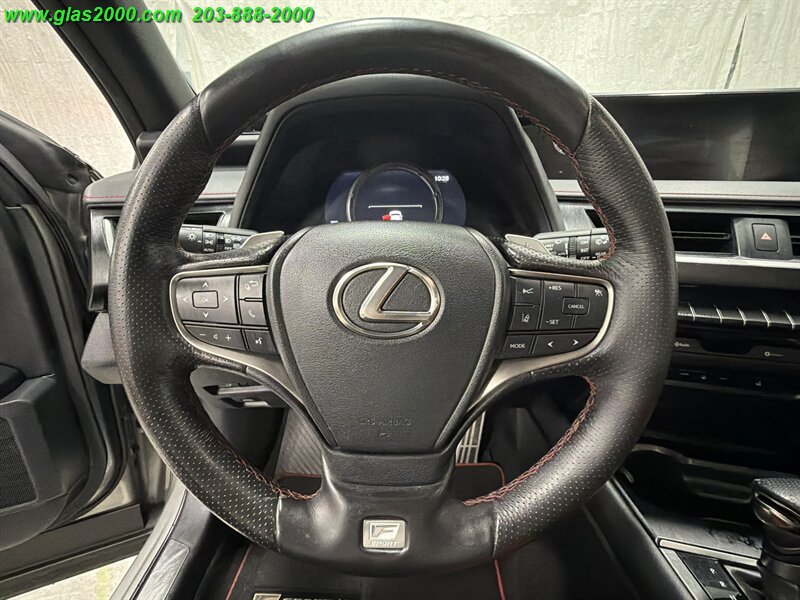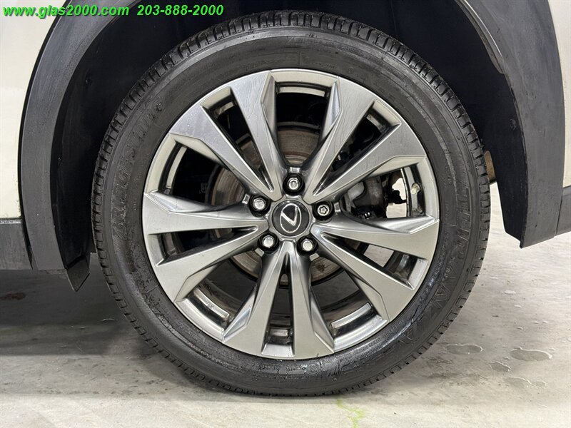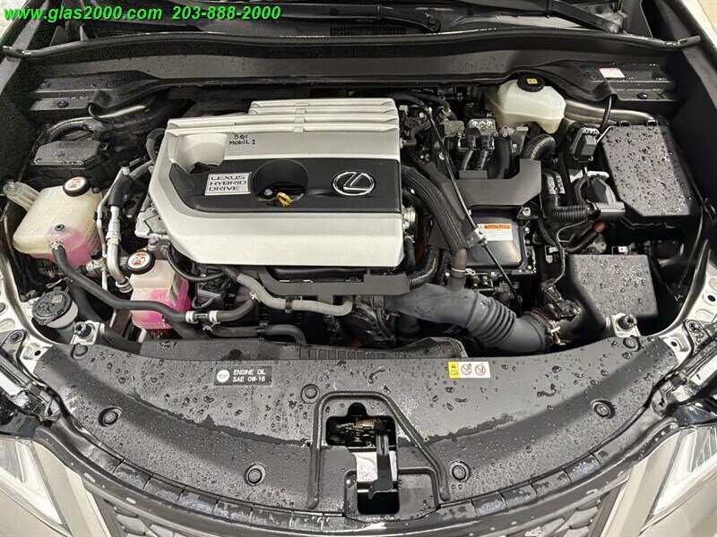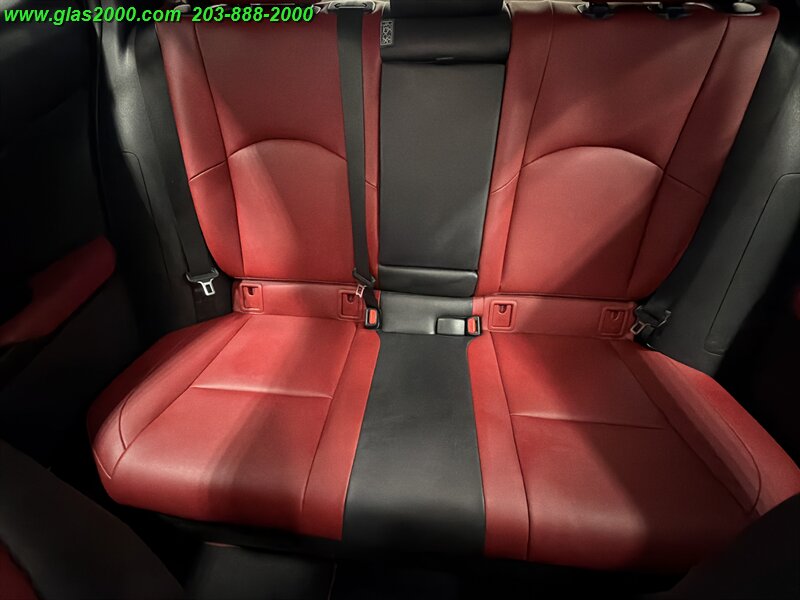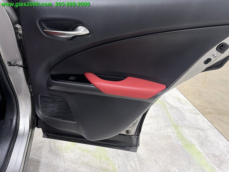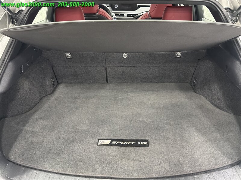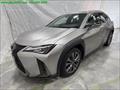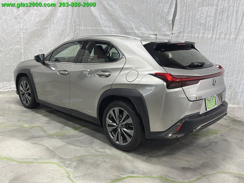 2019 Lexus UX 250h — Silver exterior, Red interior. Factory 2.0L hybrid I4 with a combined 181 hp and continuously variable transmission, EPA-rated 41 MPG city / 38 MPG highway. Factory-standard equipment includes Lexus Safety System+ (adaptive cruise control, pre-collision with pedestrian detection, lane-departure alert with steering assist, automatic high beams), LED headlights and taillights, backup camera, keyless entry with push-button start, automatic climate control, premium synthetic leather seating, power-adjustable driver seat, alloy wheels, Bluetooth connectivity, USB ports and an infotainment display. Priced below J.D. Power Book value, under 58,000 miles (averaging less than 8,000 miles/year) and in excellent overall condition.